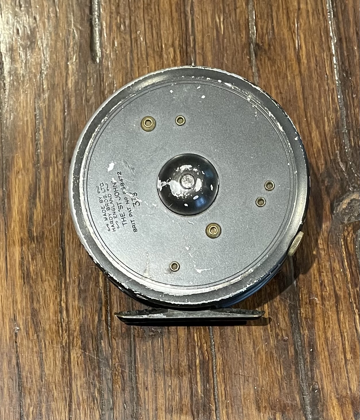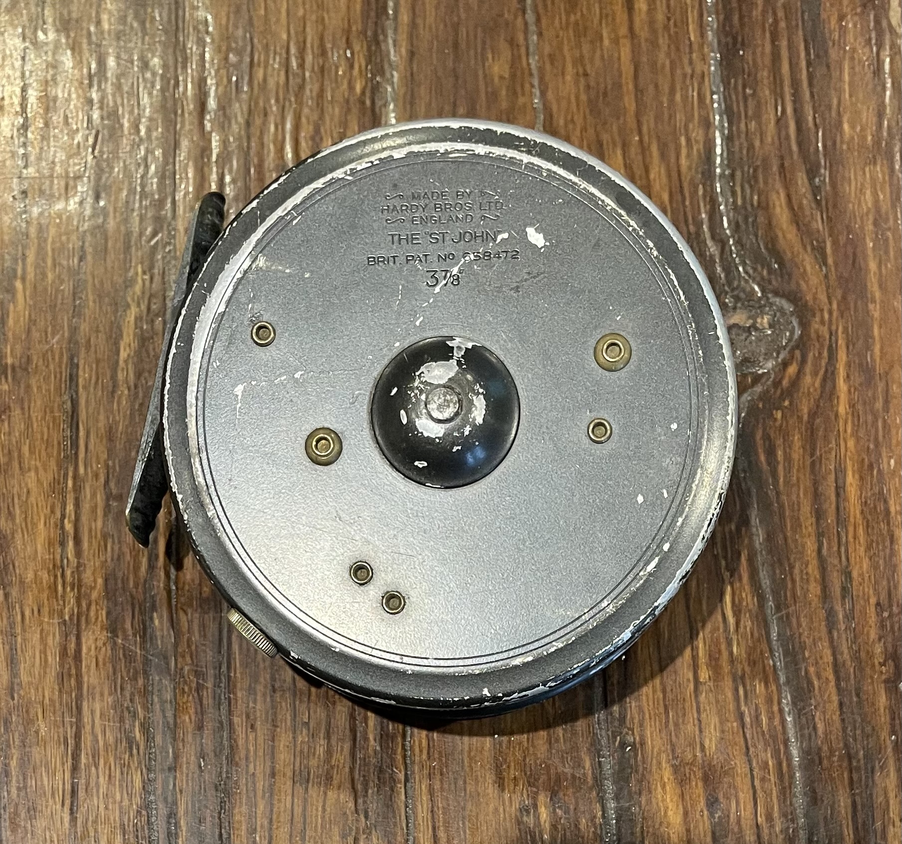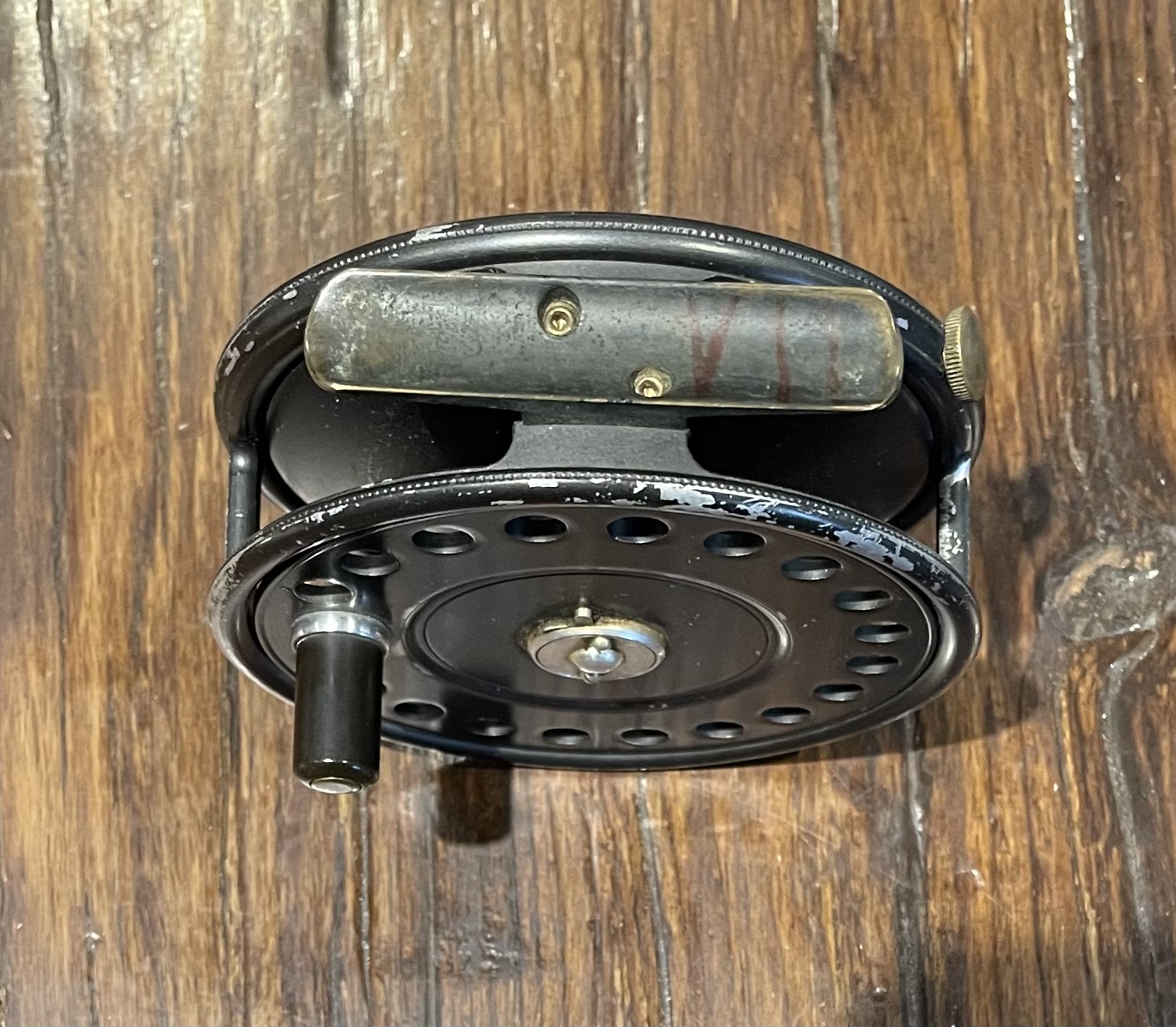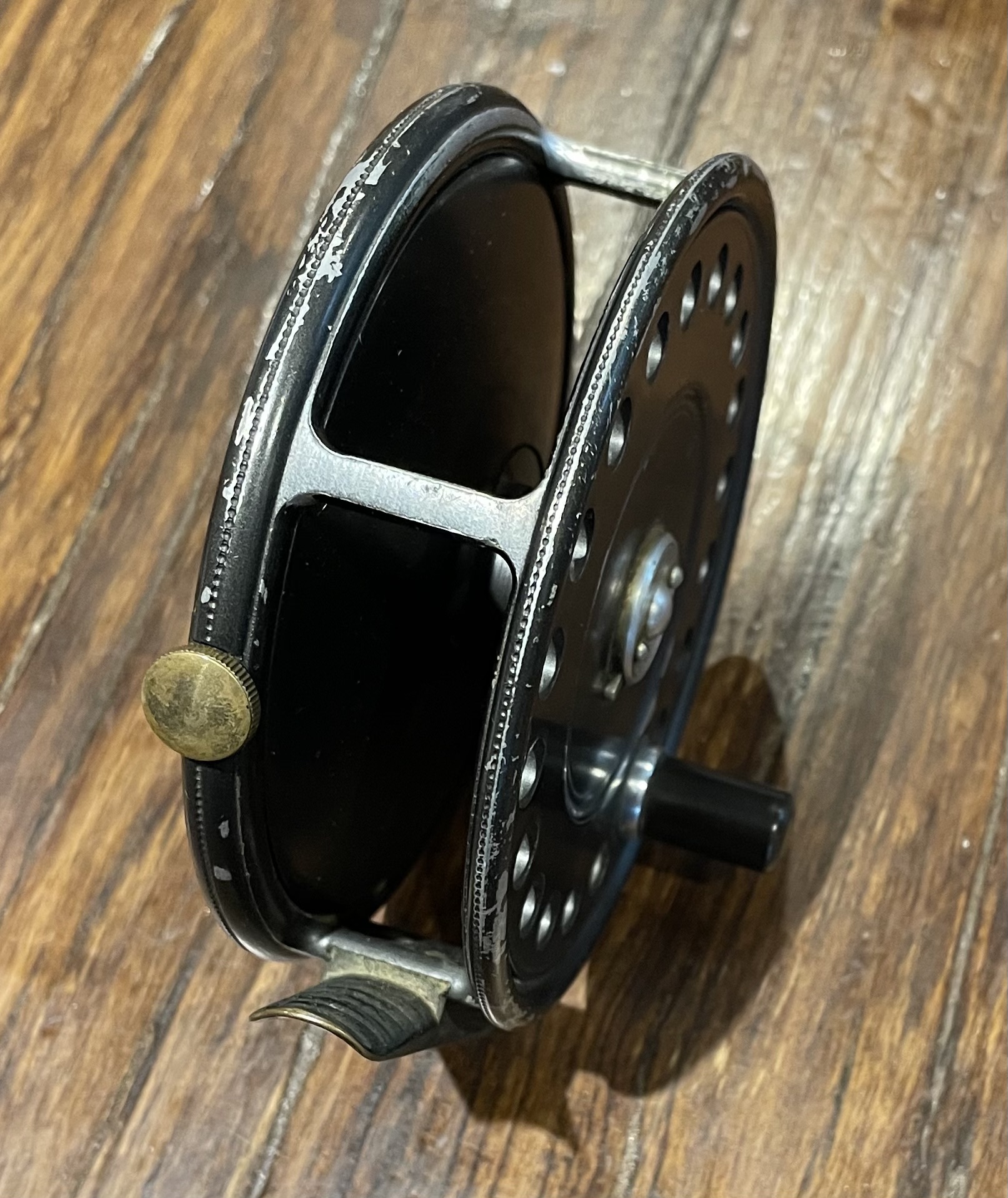 Hardy 3 7/8″ St John fly reel. 1950s Enameled black finish with full length brass ribbed foot. 2 screw latch. Black Ebonite handle.