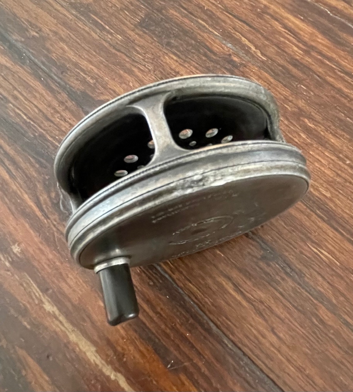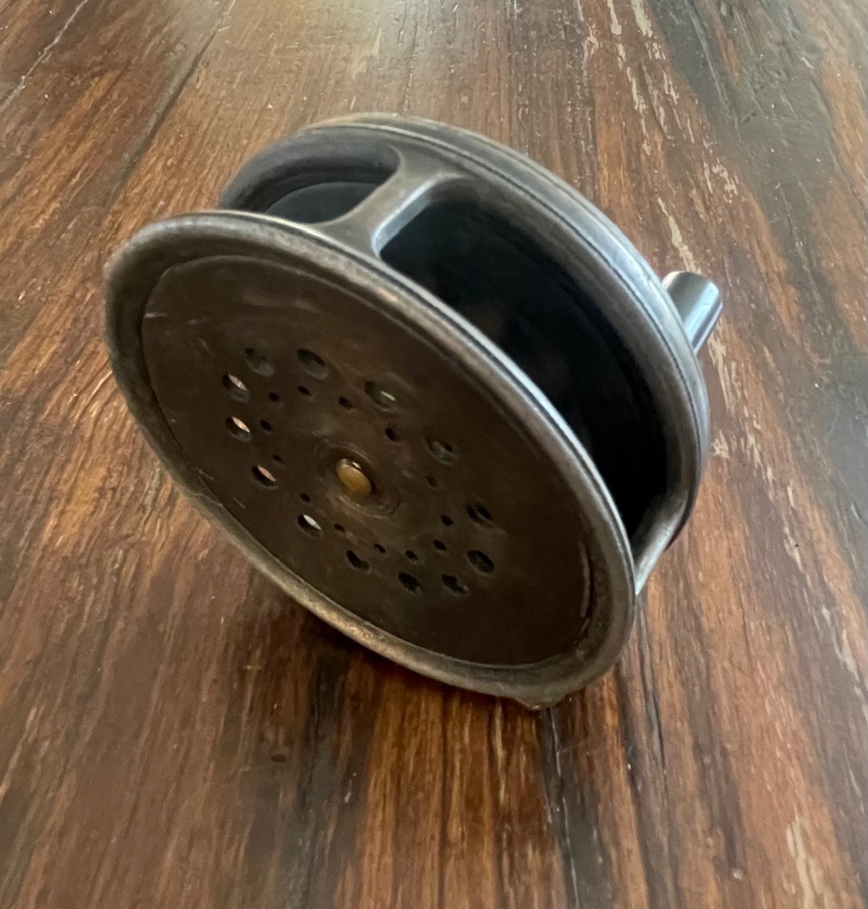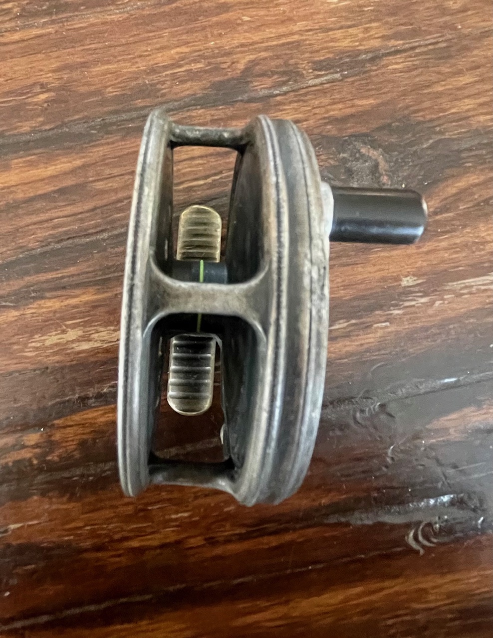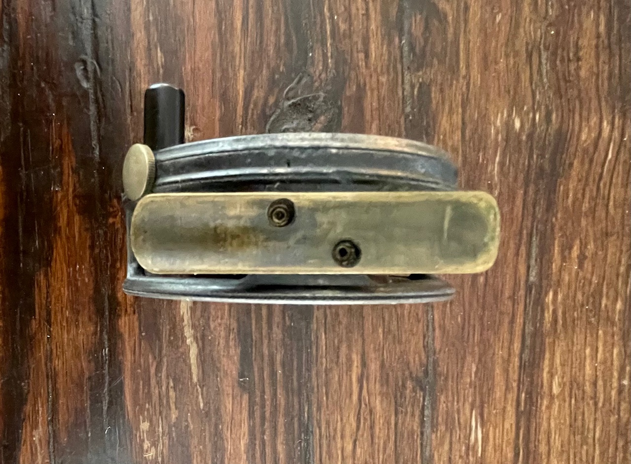 1930s era reel with full length ribbed brass foot, and leaded finish.