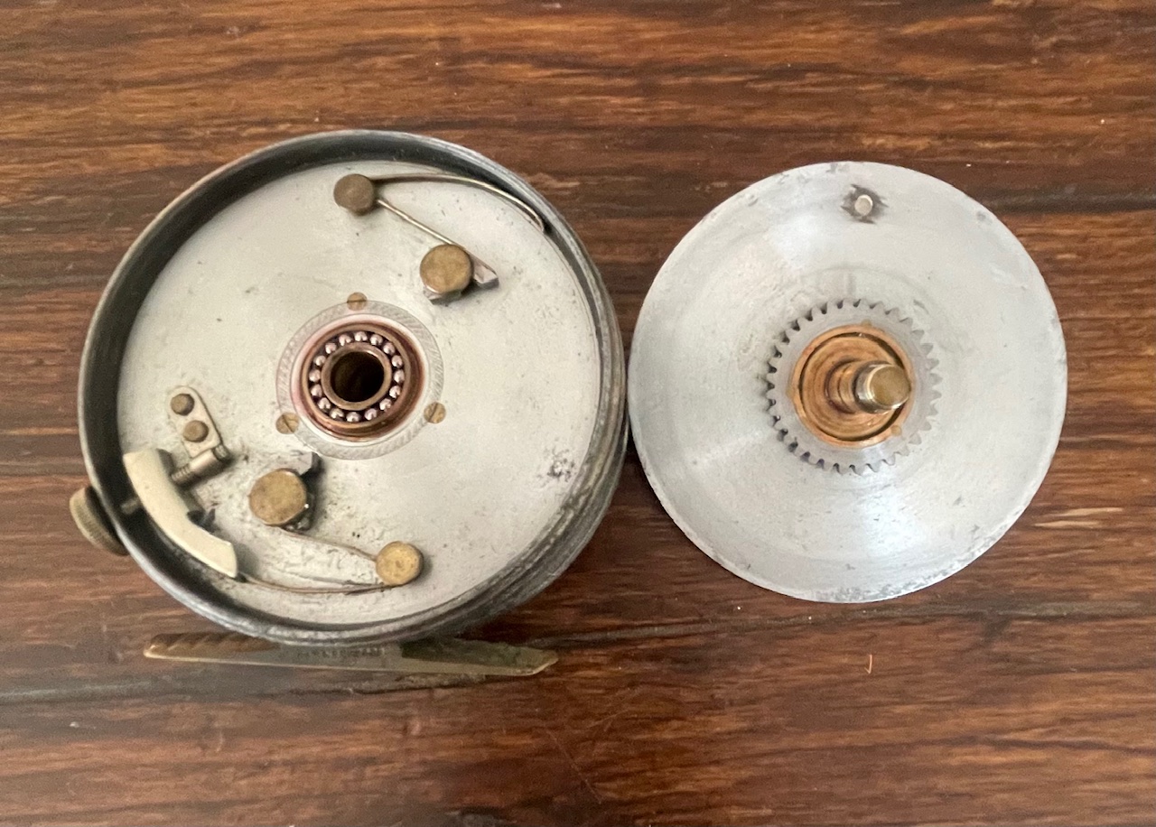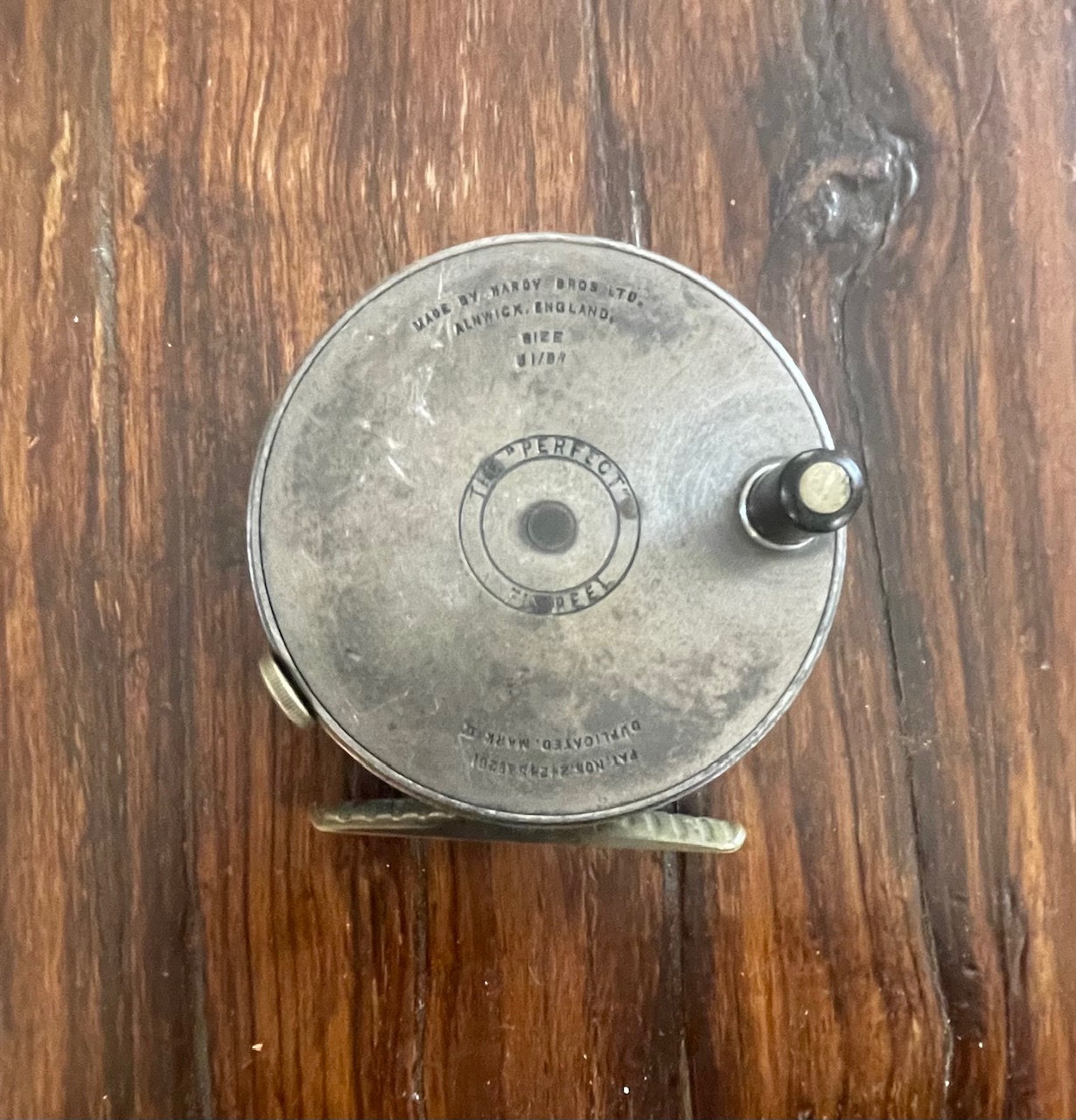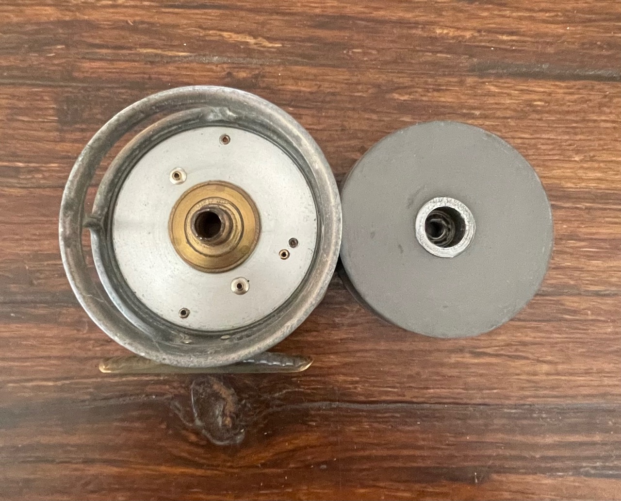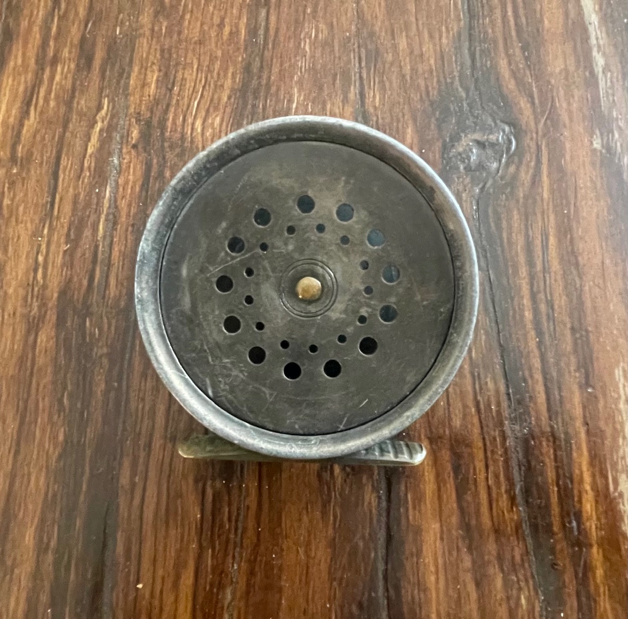 1930s era reel with full length ribbed brass foot, and leaded finish.