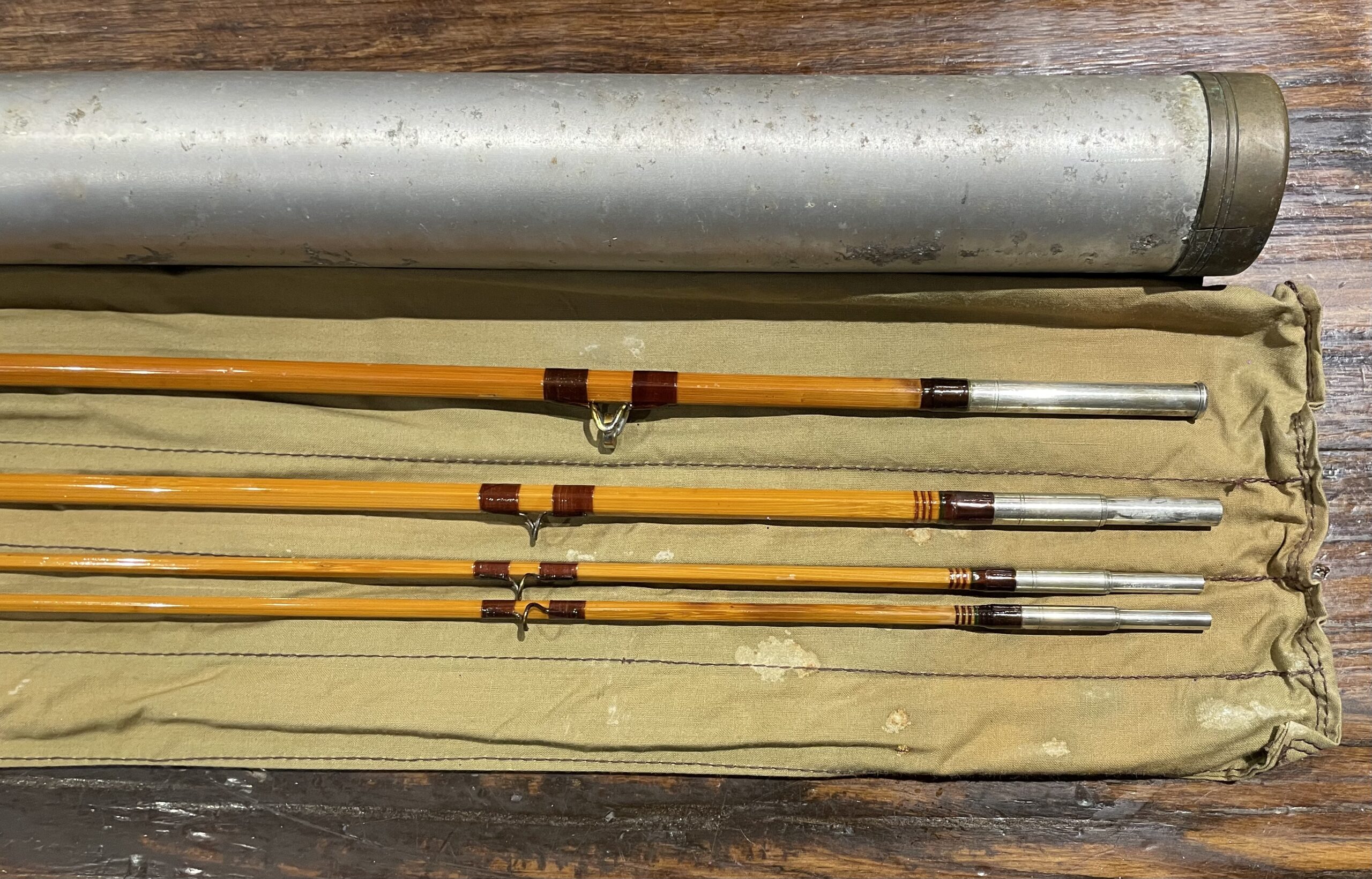 All sections full length and straight with nice light tips.  Downlocking Hardy style locking seat.  Should cast a 5wt very nicely.