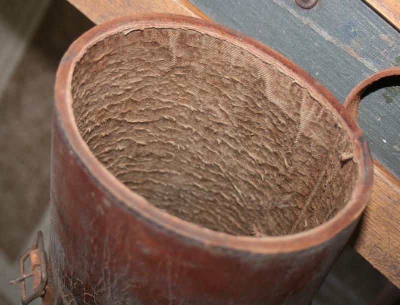 Inside felt lining is worn. Outside leather is cracked and weathered.