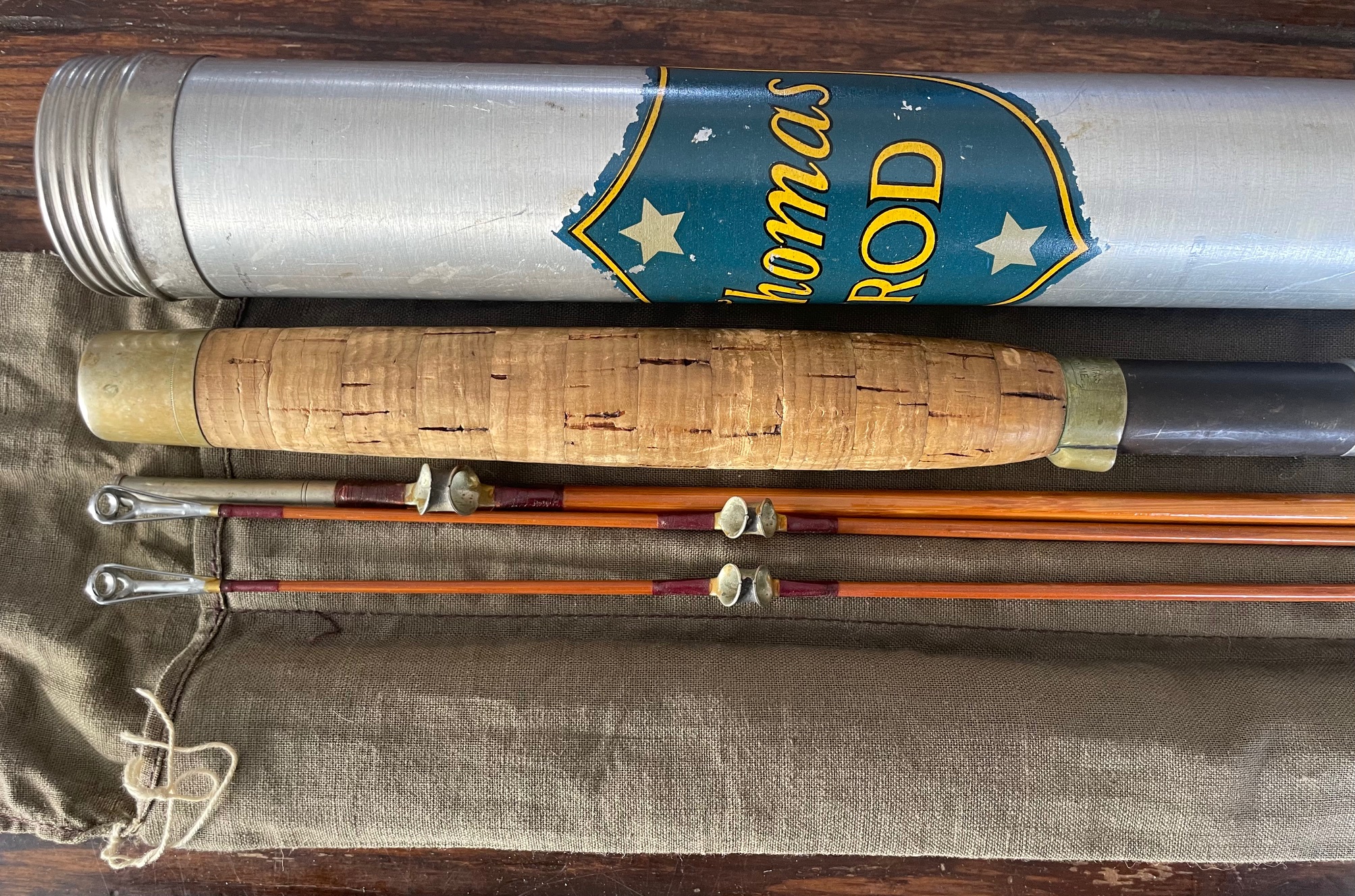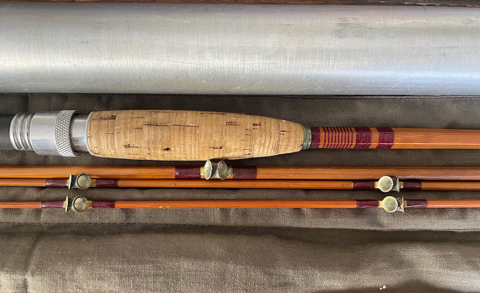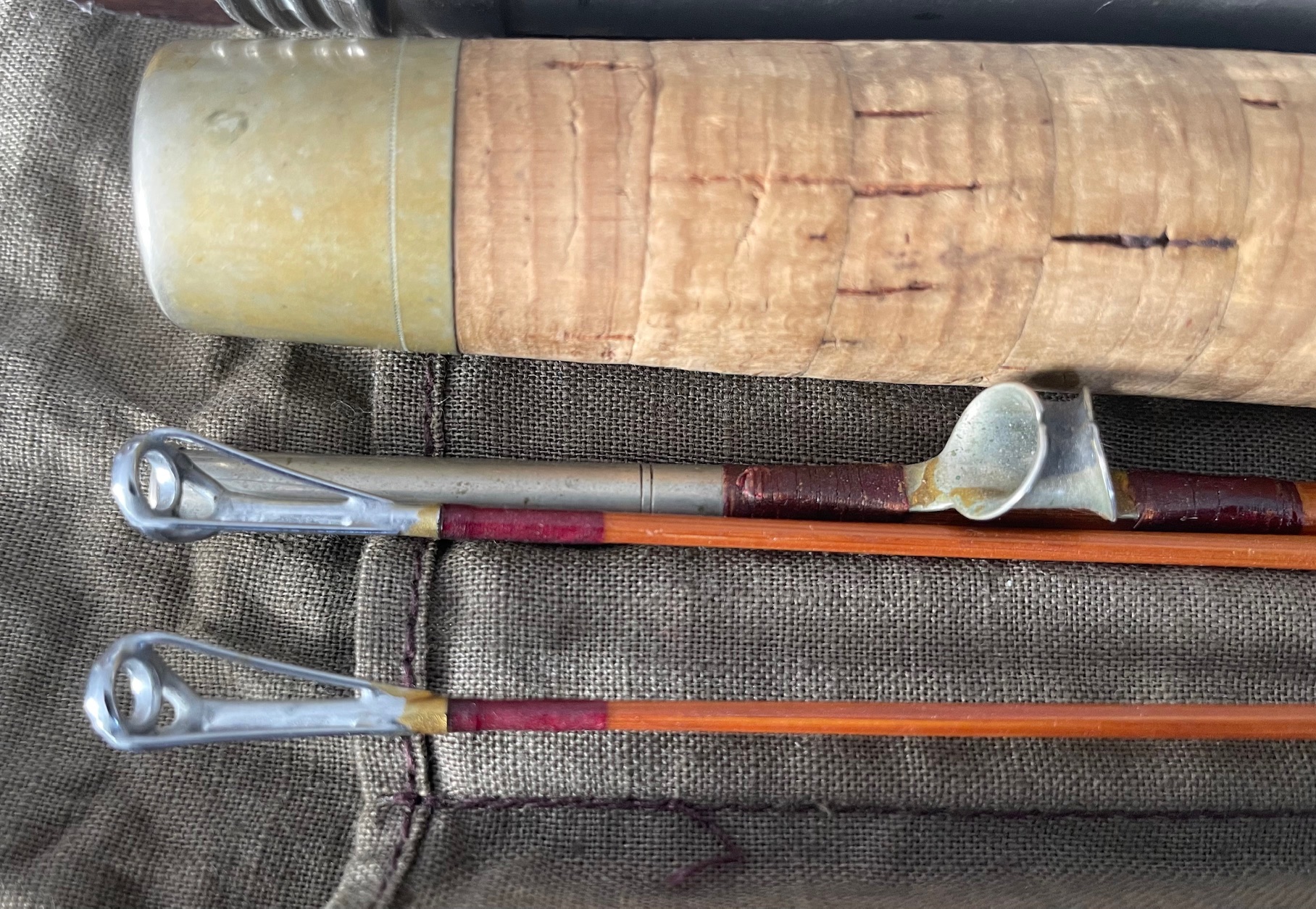 Made in 1948.  3pc, 2 tip rod weighs 6 1/4oz.  Has Thomas “trumpet” line guides, and standard stripping guide.