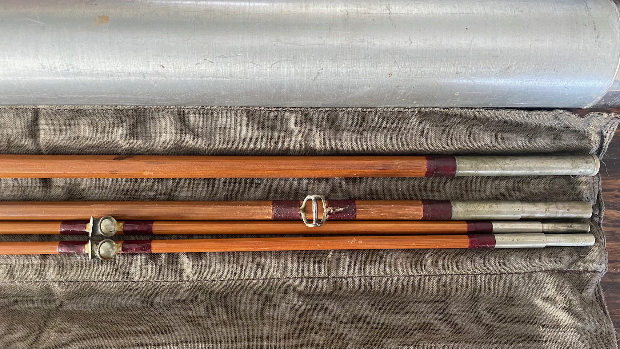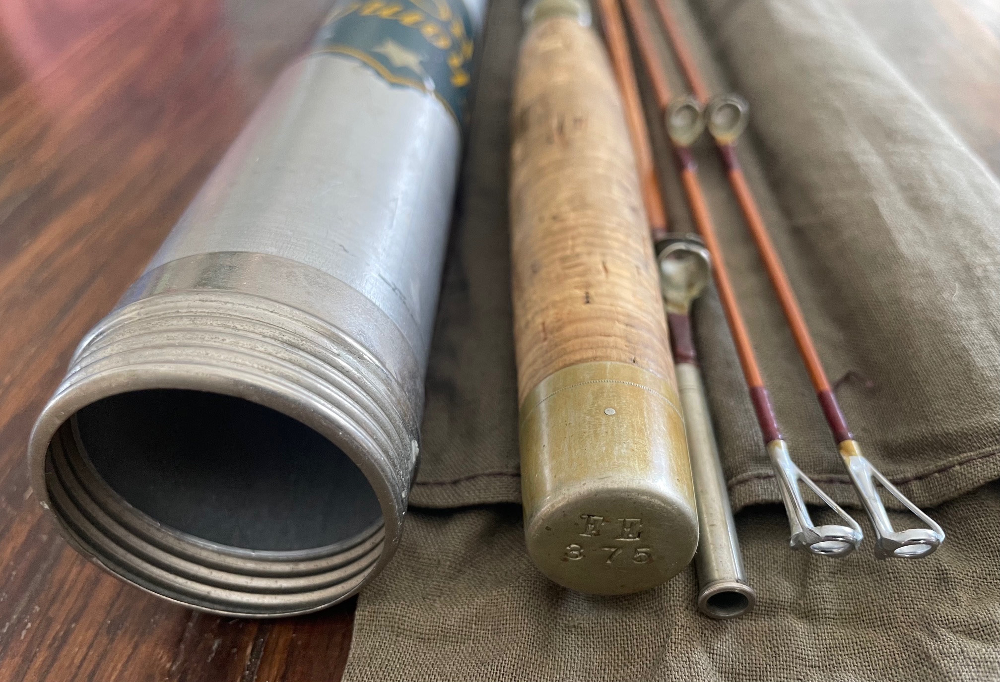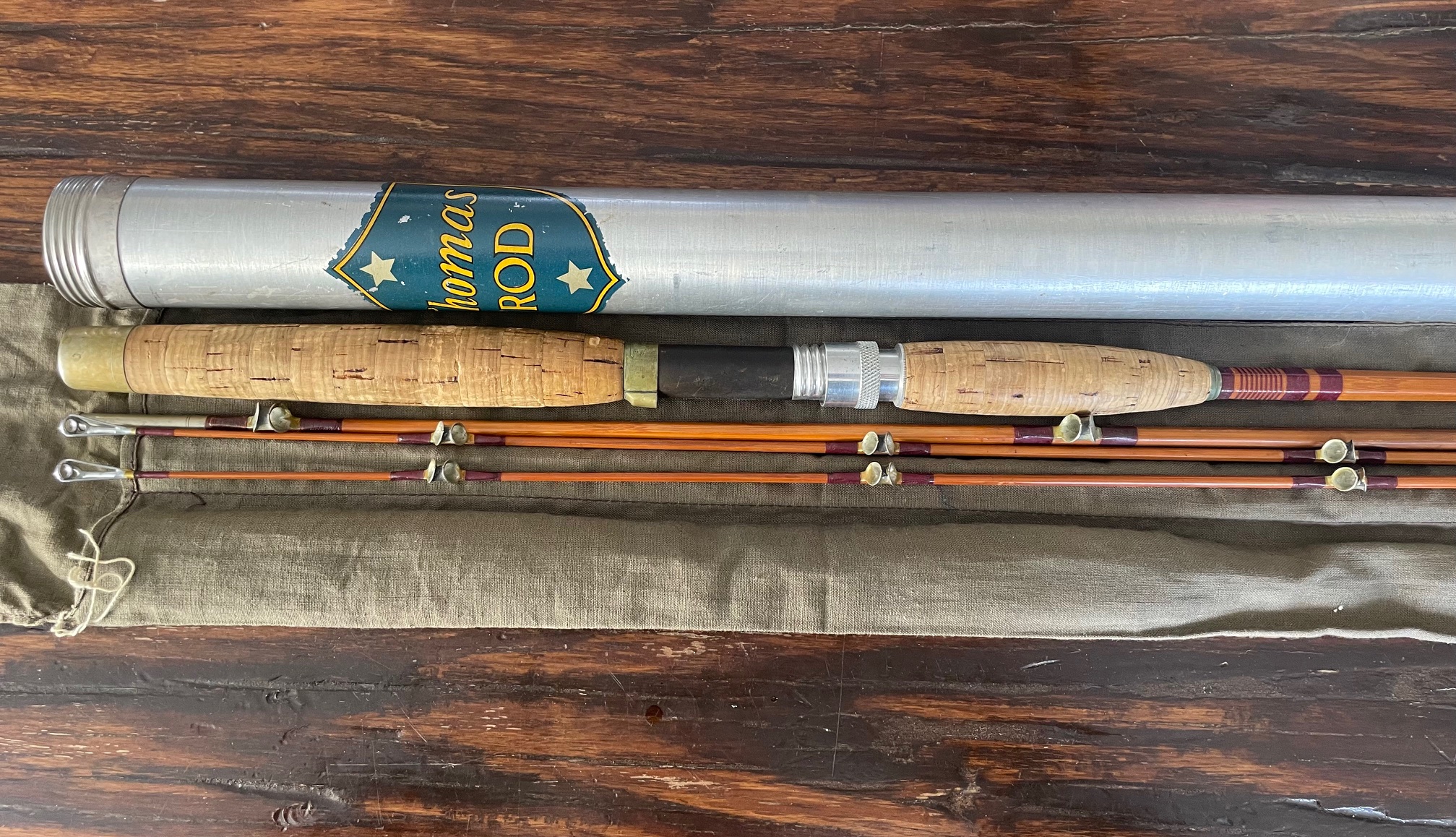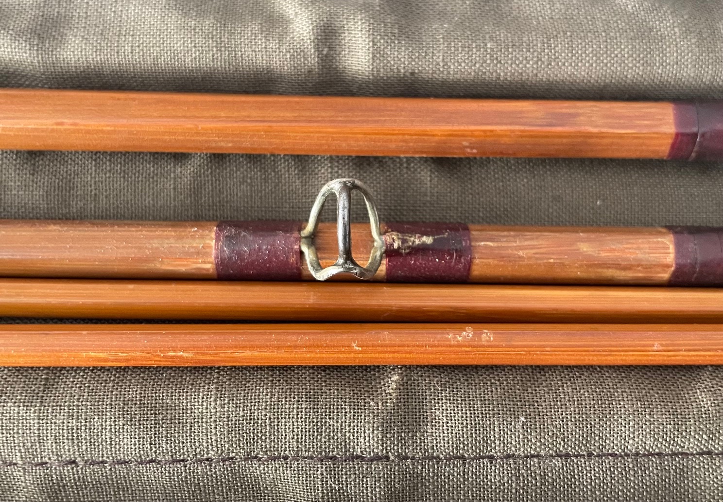Made in 1948.  3pc, 2 tip rod weighs 6 1/4oz.  Has Thomas “trumpet” line guides, and standard stripping guide.