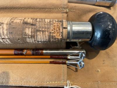 Vintage 1941 Thomas 12′ 3/2 Two-Handed Salmon rod. Rod is all full length and straight. Weighs 15 1/2 oz.